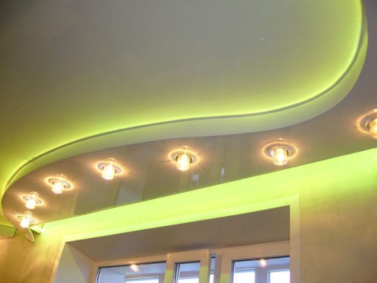 - Через велику кількість світильників, вмонтованих в стелю, його покриття може оплавитися, а також на ньому залишаться кола – сліди від плафонів. Про це потрібно подумати до установки натяжної конструкції. Виберіть лампи з невеликою потужністю, подбайте, щоб плафони не стикалися з поверхнею полотна, забезпечте їх термоізоляцію.