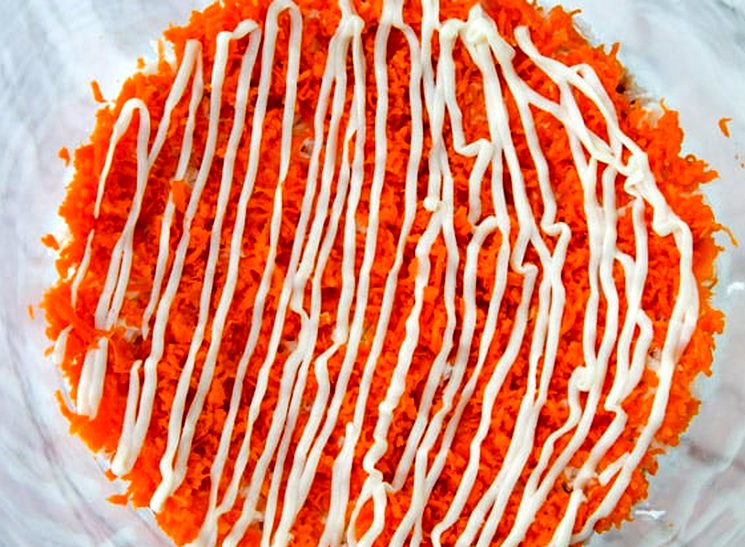 Все готово – приступити до формування шарів, промазаних майонезом, в прозорому блюді з бортиками в наступному порядку: 1 – подрібнені яєчні білки; 2 – протерта на тертці картопля; 3 – протерта на терці моркву; 4 – подрібнену рибу; 5 – подрібнену цибулю; 6 – половина подрібнених жовтків; 7 – прямо над салатом потерти на середній терці вершкове масло, отвердевшее в холодильнику; 8 – завершити посипанням через сито перетертими жовтками.