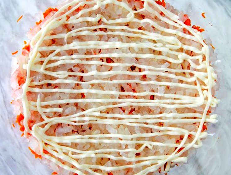 Все розкладено по окремих ємностей, приготовлено підходяще прозоре страви, на яке шарами, промазуючи кожен майонезом, викладати їх в такому порядку: 1 – половина м'ятою риби; 2 – рис, заправлений напередодні; 3 – подрібнений сир; 4 – рубані білки; 5 – залишилася подрібнену рибу; 6 – подрібнену цибулю; 7 – половина пом'ятих жовтків; 8 – вершкове масло, яке промазати рівним шаром майонезу; 9 – посипати тертий через сито залишився жовток.