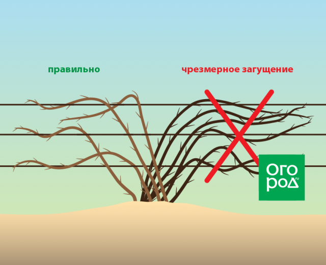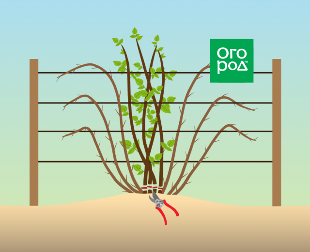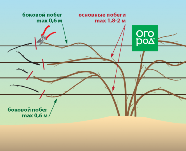 Центральні стебла молодої лози прищипните, залишивши їх довжиною не більше 1,8-2 м.Довші гілки ускладнюють доступ до ягодам, особливо, якщо у куща віялова крона. Бічні пагони також укоротите, залишивши від них близько 60 см.