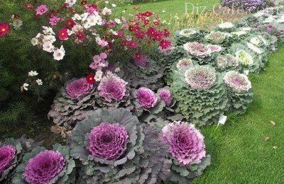 Дуже добре поєднується з барвистими однолітниками і декоративна капуста, головки якої вінчають шикарні фіолетово-зелені «корони»