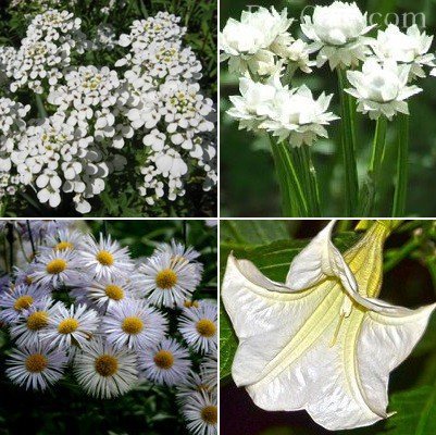 Вишуканими білими квітами прикрашені: иберис зонтичний, Аммобіум крилатий, мелколепестник гібридний і дурман запашний