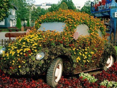 Незважаючи на те, що автомобіль виглядає зарослим природним чином, ми не сумніваємося, що це клумба, що складається з невибагливих, але досить ефектних кольорів