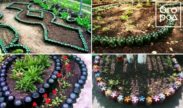 Огорожа грядок пляшками зробити досить просто: підберіть пляшки приблизно однакового розміру і встановіть їх догори дном в заздалегідь вириту вузьку траншею. Для міцності можна попередньо насипати в кожну пляшку трохи піску. Хочете, щоб грядка виглядала яскравою і барвистою? Пофарбувати денця пляшок водоемульсійною фарбою.