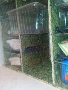 Розмір контейнера 170 × 120 × 67 мм. Вийшов досить великий контейнер для дрібниць. Каркас боксу, куди кріпимо контейнери для дрібниць, зробили з 6 мм плит OSB. Виходячи з наявного простору на стіні, у нас вийшло 4 ряди по 8 коробочок для дрібниць. Для організації висувних ящиків краю по довгій стороні контейнерів обрізали. Як напрямні використовували кутовий перфорований профіль для штукатурки. Ми такий же профіль використовували при виготовленні переносний сітки для сушки фруктів. Профіль до OSB прикріпили меблевими скобами.