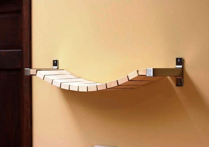 Увага! Полиці можуть бути самих різних варіацій: у вигляді пожежної драбини, кола, сот, півкола, виготовлені зі старого ящика, телевізора, сходи і навіть невидимі. Остаточний вибір конструкції залежить від смаків мешканців будинку і стилю кімнати, в якій вона буде встановлюватися.
