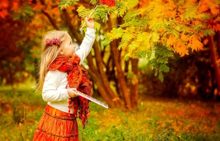 Відмінна ідея для осінньої фотографії – фото з маленькою палітрою і пензлем – створіть композицію ніби ваша дитина сам розфарбовує жовте листя або яскраві червоні грона горобини.