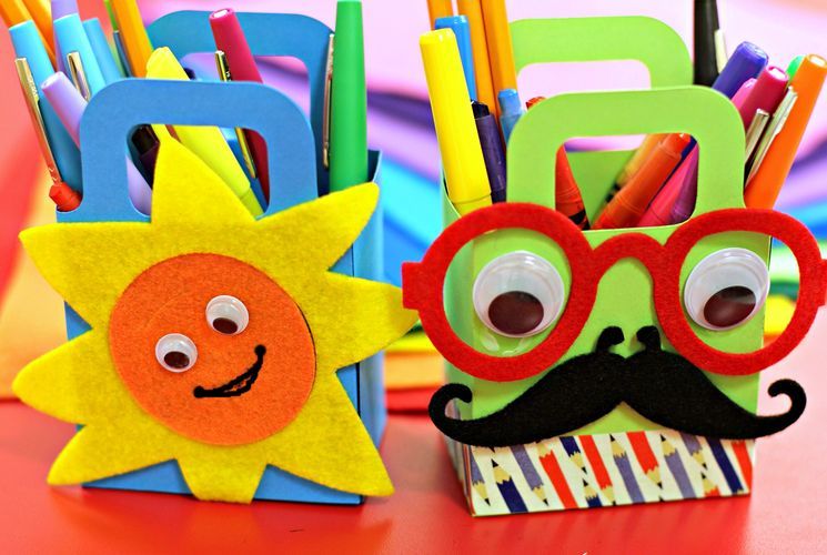 За допомогою кольорового картону, яскравих шматочків фетру і клею, ми можемо зробити яскраву підставку для олівців, ручок або фломастерів.