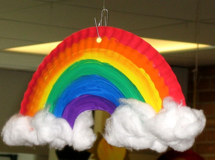 А ось ще одна ідея з одноразових паперових тарілок – розрізаємо одну з них навпіл, робимо знизу невелику «виїмку» та розфарбовуємо нашу веселку. До основи приклеюємо хмари з вати і за допомогою скріпки робимо петельку.