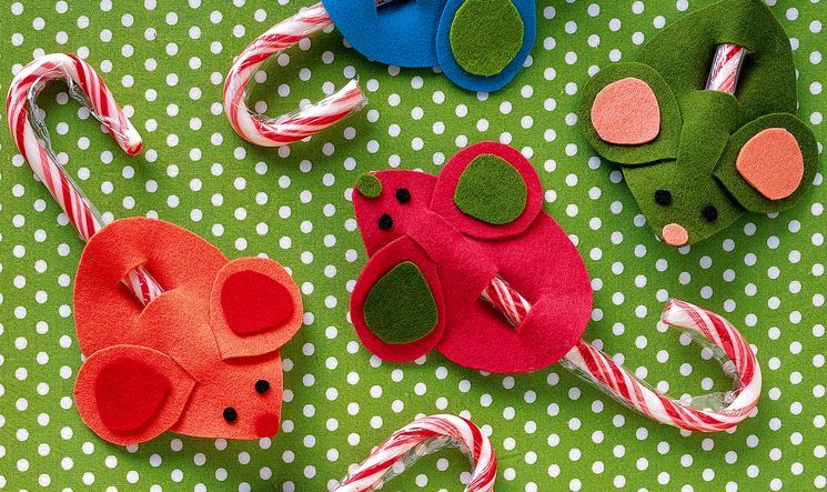 Дуже просто зробити мишок з фетру з сюрпризом – з хвостиком з карамельної палички. Вийде яскраво, цікаво і смачно.