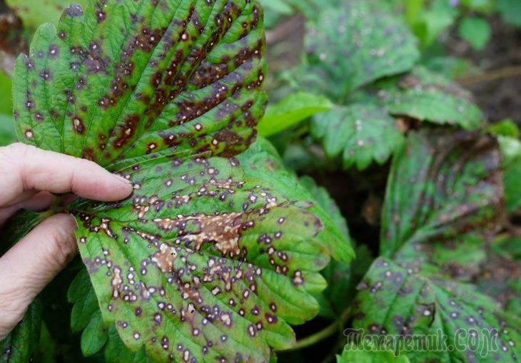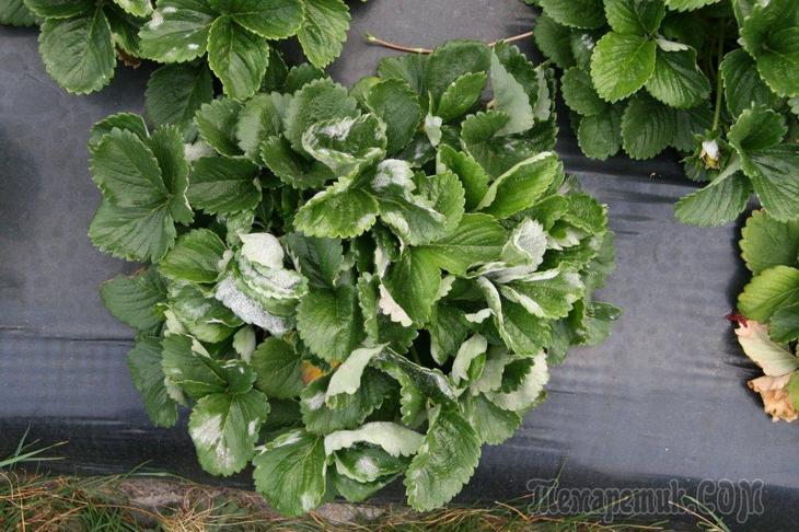 Перша ознака появи цієї хвороби – це фіолетовий колір листових пластинок полуниці, потім вони скручуються і стають попелясто-сірими, як ніби посипаними старої борошном. Якщо не хочете, щоб ця хвороба заглянула до вас в гості, то ранньою весною обробіть рослини слабким (трохи рожевим) розчином марганцівки або 1% колоїдної сіркою.