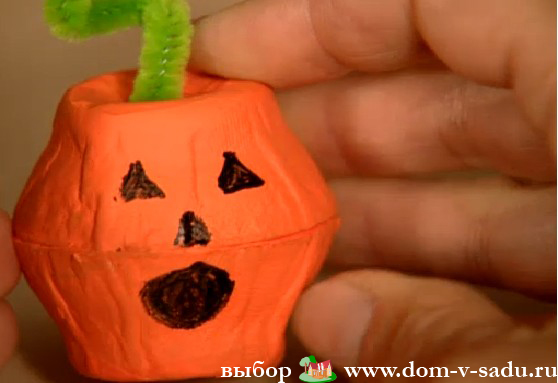 Намалюйте риси обличчя маркером. Очі і ніс – трикутнички, рот – овал. З верхнього боку, там де мається на увазі голова зробіть отвір кінчиком ножиць або канцелярським ножем. Через отвір просуньте зелену волохату дріт для дитячих виробів – це буде гарбузовий стеблинка.
