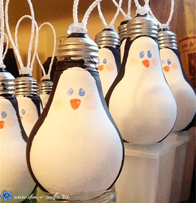 Пингвинчики. В основі цих виробів – класичні лампочки у формі груші. Вони наводять на думку про багатьох живих істот. Новорічними персонажами просяться стати пінгвіни. Адже вони живуть там, де холодно.