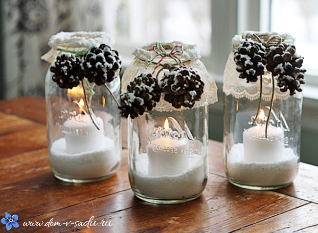 Оригінальні свічники – чудові вироби своїми руками для будинку. Створити щось на зразок засніжених і замерзлих судин допоможе проста сіль. Для цього досить змастити місця, які повинні бути «засніжені» клеєм ПВА. Далі обмокти свічник в сіль. Для кращого результату рекомендується змішати сіль екстра (дрібну) з великої (можна взяти морську з синіми або блакитними барвниками). Тоді сніг буде переливатися, як справжній. Особливо, коли в такі новорічні прикраси поставлять свічки і запалять їх.