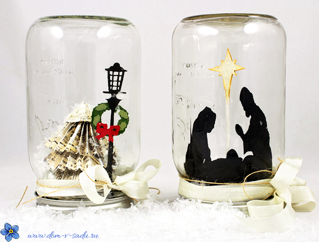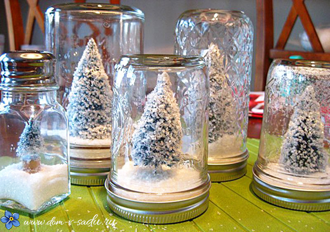 Спочатку кладемо «сніг» на кришку баночки. Встановлюємо на неї щільно декоративну фігурку (можна навіть приклеїти супер клеєм). Зверху закриваємо новорічну композицію банкою. Перев'язуємо декоративною стрічкою і відмінні креативні вироби на Новий рік готові!