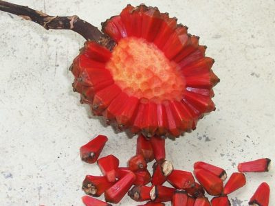 Квітки одностатеві. Чоловічі зібрані в суцвіття, схожі на колоски. Жіночі – нагадують початок або конус. Плоди червоного кольору, м'ясисті. Чимось нагадують ананас.