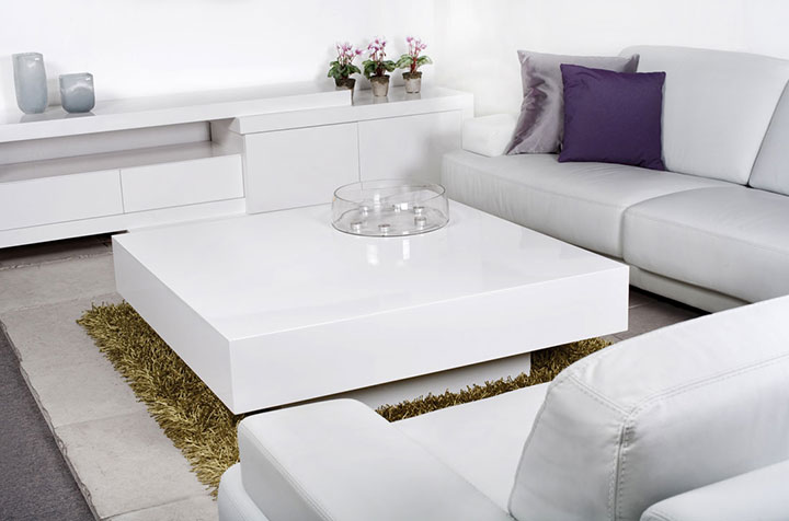 Столи в обстановці сучасної вітальні не обов'язково виконуються з дерева. Для виготовлення каркаса беруть метал, багатошарові матеріали. Стільницю роблять також зі скла, кольорового пластику. Її форма вписується в традиційний набір: овал, коло, прямокутник. Ноу-хау стилю – гарнітур меблів з багатошарового матеріалу, обтягнутого еко-шкірою. Обідній стіл у вітальні зазвичай не мають, зате ставлять невисокий журнальний, кавовий або письмовий.
