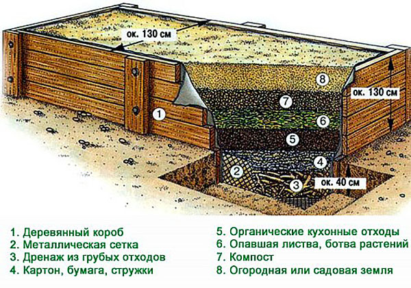 - високі гряди запобігають втрату елементів живлення і вуглекислоти, що виділяється мікроорганізмами.