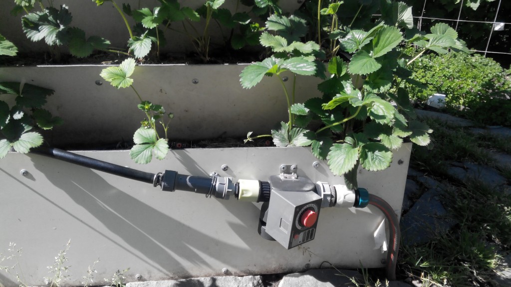 Для автоматизованого поливу піраміди використовували систему мікрокраплинної поливу Gardena. Від таймера поливу під стінами піраміди вгору провели шланг 13,7 мм з відведенням на кожну сходинку. За сходинці розведення зробили шлангом 4,6 мм. Крапельниці з витратою 2 л / год. Відстань між крапельницями близько 25 см. На піраміді встановили 72 крапельниці. Кущі суниці садили біля крапельниць. На площі 1,5 кв.м. в саду розмістилося 72 куща суниці!