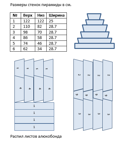 На ярусную грядку-піраміду необхідно два листа алюкобонда 122 × 244 см. Товщина 3-4 мм. Бажано світлого кольору, щоб стінки не сильно грілися на сонці. Для зміцнення стінок піраміди використовуємо профіль для гіпсокартону 27 × 28 × 0,6 мм. Довжина профілю 3 м. На піраміду необхідно 15 шт. Кріплення алюкобонда до профілю виробляємо шурупом для кріплення металевих профілів (насіння). Їх потрібно близько 300 шт.