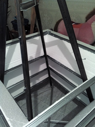 Для того, щоб стінки піраміди не перегрівалися влітку і не промерзли взимку, утеплюємо внутрішню частину стінок пінопластом 20 – 30 мм. Пінопласт вставляємо на внутрішню сторону стіни між прикріпленими профілями.