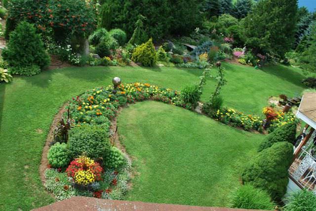 Великий ділянку дасть можливість вибрати місце для всього. Головне, визначитися з основними будівлями і насадженнями. Інший же ландшафт відіграє лише декоративну роль. Це можуть бути насипу, газони, алеї, якщо, звичайно, є місце для цього всього.