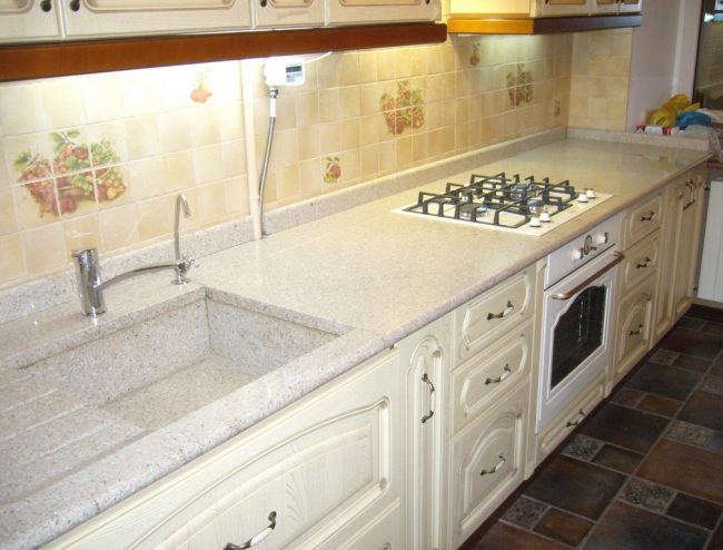 Порада. Якщо вам не хочеться постійно переживати за зовнішній вигляд кухні, то краще всього вибрати пластикову стільницю світлого кольору або темну, але з вираженими світлими вкрапленнями, наприклад, під граніт або кварц;