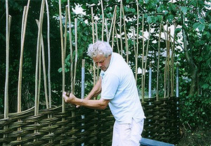 Після цього досить взяти прутики і почати протягувати через підготовлені горизонтальні планки. Нанизувати гілки потрібно у вертикальному напрямку, злегка згинаючи в процесі плетіння. При цьому потовщені закінчення повинні йти в підготовлений фундамент і щільно в нього упиратися.- Щоб гілки були щільно притиснуті один до одного, їх необхідно трохи утрамбувати за допомогою молотка, а потім перев'язати зверху між собою міцною дротом, мотузкою або волосінню.