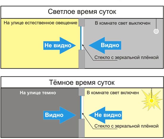 Увага! Майте на увазі, що в темний час доби, коли включений яскраве світло, плівка стає більш прозорою, тому необхідно додатково використовувати штори або жалюзі, щоб зменшити видимість з вулиці.