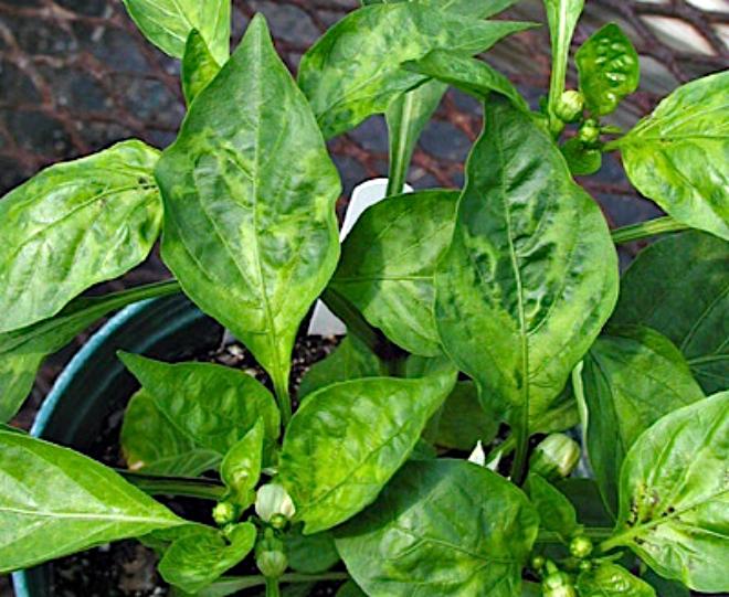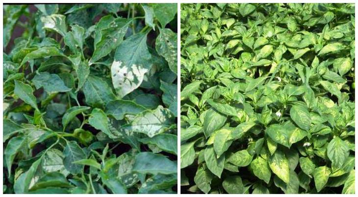 Це небезпечне вірусне захворювання проявляється на листках перцю і баклажанів у вигляді мозаїчних плям блідо-жовтого кольору.
