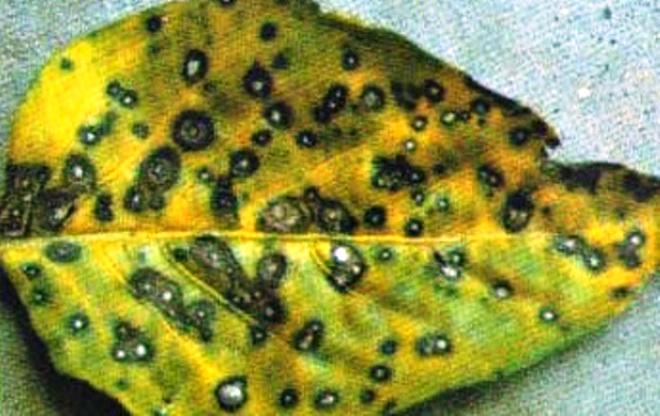На листі і пагонах з'являються невеликі виразки, які згодом перетворюються в світло-коричневі плями з темною окантовкою. Незабаром вони розростаються і зливаються, хвороба перекидається на плоди, рослина в'яне.