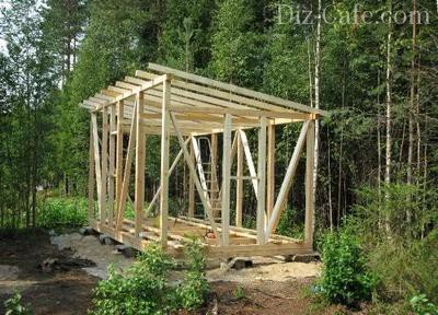 Каркас приміщень готовий, тепер можна зробити каркас даху. Для односхилого даху потрібні бруски 50х100мм. В випив несучих брусків вставлятимуться крокви. Фіксація відбувається за допомогою саморізів. За периметр самої битовки крокви повинні виходити на 30см. В якості покриття вибираємо ондулін, як не вимагає особливих будівельних навичок. Загальна конструкція даху обов'язково містить гідро- і пароізоляцію і утеплювач.