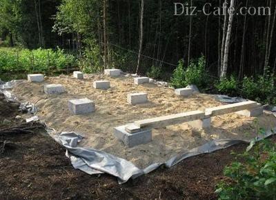 Отже, перш за все з поверхні землі на місці розміщення шлакоблоків потрібно зняти родючий шар, землю гарненько утрамбувати і застелити геотекстилем, після чого засипати піском і знову утрамбувати. На підготовлену основу встановлюємо шлакоблоки, розташувавши їх по кутах і через кожен 1,5 метра. Шлакоблоки необхідно гідроізолювати за допомогою руберойду або бітумної мастики, після чого анкерним методом закріплюється дерев'яний каркас споруди.