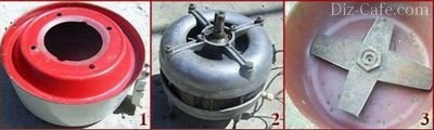 Процес виготовлення подрібнювача трави не так складний, як здається. На фото: №1 – корпус, дуже зручний, тому що в нього можна завантажувати траву зверху, №2 – двигун від пральної машини, № 3 розташування і зовнішній вигляд ножів