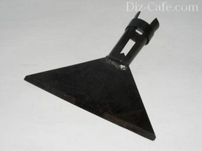 На висоті 15 мм у верхній частині циліндра болгаркою зняті межі, щоб утворився квадрат зі стороною 25мм. На нього і будуть вдягатися ножі. Щоб зробити ножі, потрібно з пиляльного полотна вирізати 4 заготовки болгаркою. У центральній частині кожної заготовки вирізається квадратний отвір зі стороною в 26 мм. Ширина кожної деталі залежить від ступеня жорсткості вихідного металу. Зрозуміло, що поміщатися ножі повинні ближче до дна. Їх ріжучі кромки загострюють, використовуючи чавило. Болти, що фіксують втулку, поміщають вище ножів.