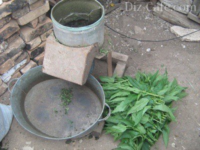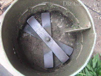 Отже, процес подрібнення нагадує роботу кухонного комбайна: в циліндричному корпусі, роль якого грає просте відро, знаходиться гостро заточений ніж. При обертанні його по колу з високою швидкістю відбувається розсічення трави. Для виготовлення цієї травосечкі використовується двухрежимная дриль «Темп», потужністю в 850 Ватт. Ніж виготовлений з пиляльного полотна. Весь секрет криється в заточенню ножа. Якщо вона зроблена правильно, трава не буде намотується на лезо. Ніж повинен залишатися чистим і вільним від зелені.