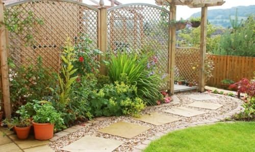 Невелика доріжка в саду або майданчик для відпочинку, краще виглядає з дрібним малюнком. Неоднакові розміри і конфігурація плит дозволять вам мати масу варіантів в малюнку мощення. Доріжки з дерева і гравію створять враження натуральності і близькості до природи.