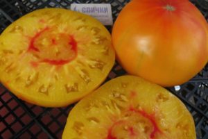 Високорослий сорт для теплиці з великими помідорами масою 400-500 г. Забарвлення дозрілих плодів просто заворожує – помідори стають оранжево-жовтими з червоним рум'янцем. При нормуванні кількості плодів в кистях деякі екземпляри можуть вирости до рекордного 1 кг!