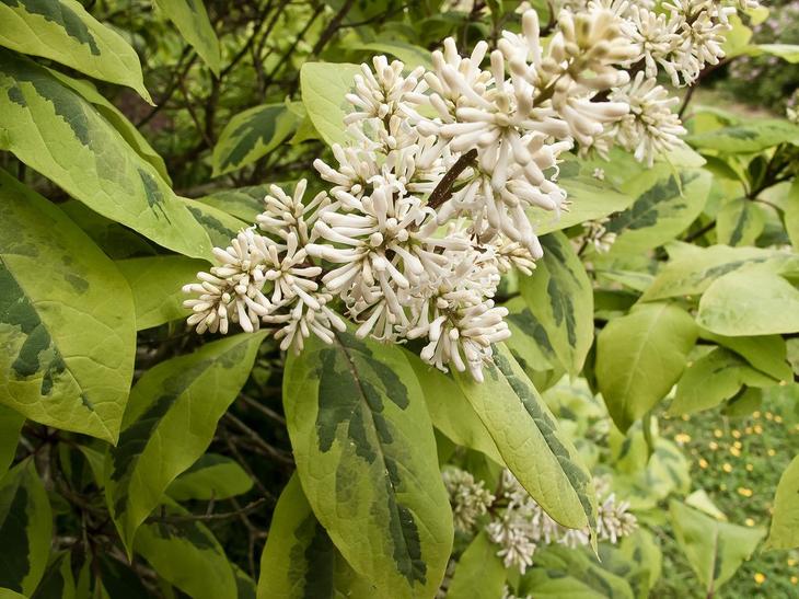 Цей густоветвистий чагарник (висотою і шириною 3-4 м) відрізняється великими листками і лілово-рожевими пухкими суцвіттями-мітелками з приємним ароматом. Квітки розпускаються в травні-червні.