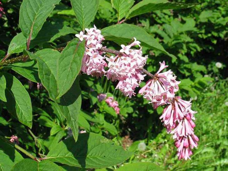 Цей невисокий (до 1,5), але широкий кущ зацвітає в залежності від погодних умов (в теплих регіонах – в травні-червні). Листя широкоовальні, на верхівці звужуються, темно-зелені. Квітки запашні, бузково-рожеві. У середній смузі в суворі зими може піддаватися вимерзання.