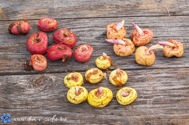 Якщо бажано розмножити будь-які сорти, перед посадкою розріжте бульбоцибулини гострим ножем на дві половинки вертикально так, щоб на кожній була нирка і частина донця з зачатками коренів.Половинкам дайте трохи обвітритися, місця зрізу присипте товченим деревним вугіллям або залийте 0,5% розчином марганцівки. До осені на половинках утворюються повноцінні заміщають бульбоцибулини, збільшиться і кількість клубнепочек.