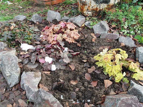 Зверніть увагу! Гейхери можуть вимокати, якщо осінь довга і дощова, а також при весняних відлигах, якщо тала вода застоюється. Тому їх слід садити або на піднятій грядці, або на штучному підвищенні з каменів, або на схилі, де вода скочується вниз.