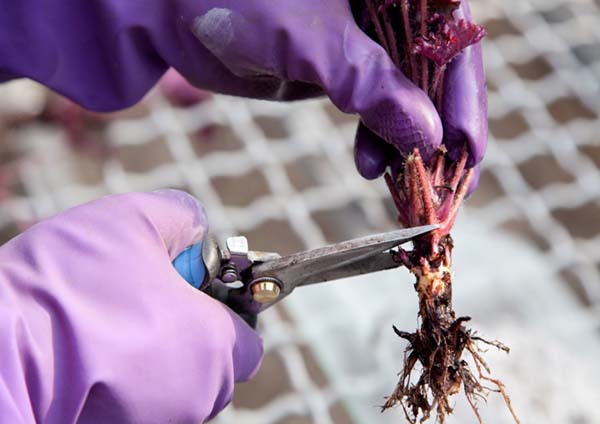 - Також потрібно позбутися від гнилих коренів (до здорових тканин, без будь-яких чорних плям), сухих пагонів і прибрати все нижнє листя.