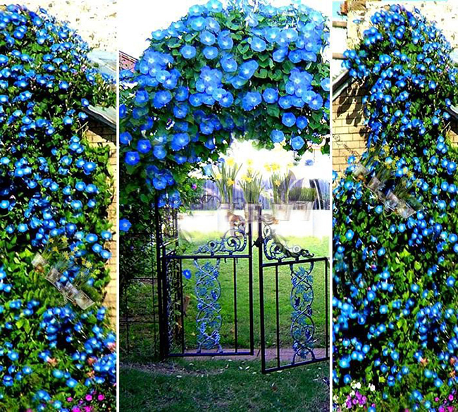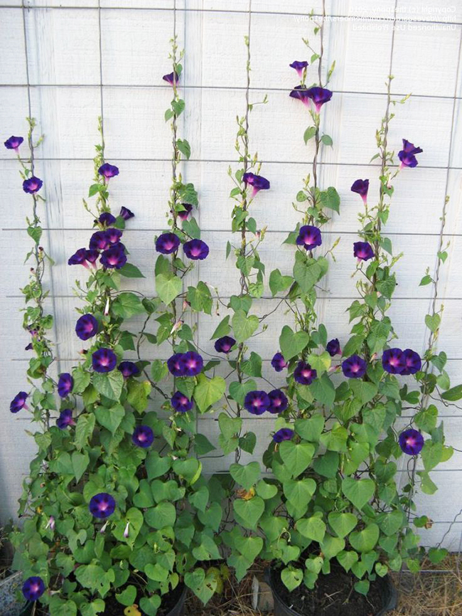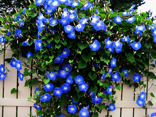 Квіти іпомея однорічна відмінний помічник при створенні в саду кучерявих композицій. Росте вона швидко, цвіте буйно квітками синіх відтінків схожих на дзвіночки, які живуть всього один день, але цвітіння всього рослини дуже тривалий. Відмінно приховує всі господарські будівлі і некрасиві паркани.