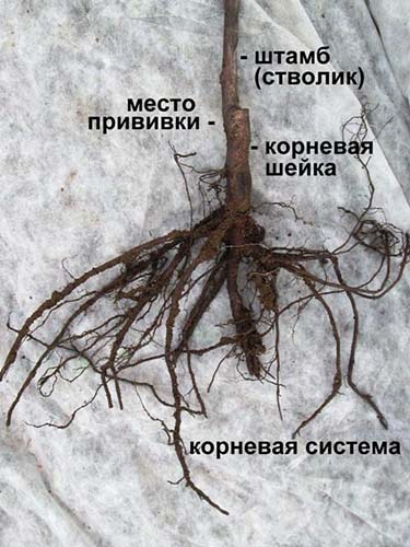 - Повинен мати добре розвинену кореневу систему (без будь-яких болячок і новоутворень), тобто, крім основного кореня, має бути ще кілька бічних (чим старше саджанець, тим більше у нього коріння), довжина яких може варіюватися від 20 до 25 см, при цьому вони не повинні бути пересушені і поламані;