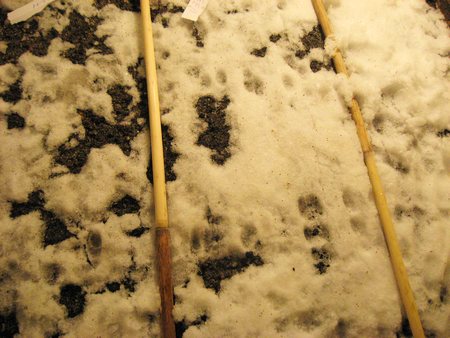 - Грунт в посадковому ящику засипають снігом і по снігу акуратно розсипають насіння. На білому тлі темні насіння добре видно, це помітно полегшує роботу. Однак сніг в теплому приміщенні тане буквально на очах, працювати треба дуже швидко.