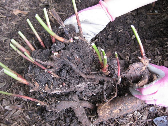 Посадкова яма повинна бути заповнена поживним складом приблизно наполовину. Зверху засипається шар среднезернистого піску. Опущену в посадкову яму кореневу систему декоративного багаторічників потрібно акуратно розправити. Нирки заміщення повинні бути заглиблені приблизно на 50 мм. Після присипки кореневої системи грунтом здійснюється рясний полив, а також мульчування грунту торф'яної крихтою.
