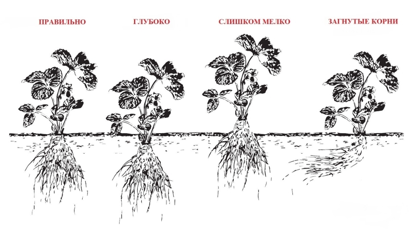 Перед процедурою коріння потрібно вкоротити до довжини в 6-7 см. Посадочні лунки не слід робити занадто глибокими. Їх глибина повинна бути порівнянна коріння полуниці таким чином, щоб вони вільно поміщалися в посадковій ямі і при цьому не загиналися.