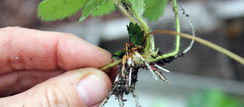 - Занадто довге коріння полуниці не дають змоги повністю розправити їх в лунці, в результаті чого вони загинаються і не забезпечують рослина нормальним харчуванням. Перед посадкою коріння слід вкоротити до 7 см.