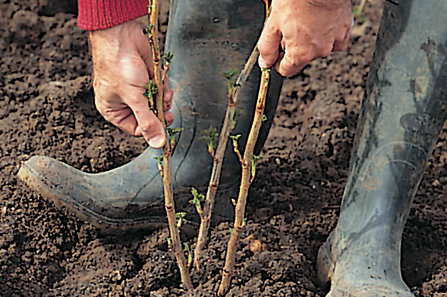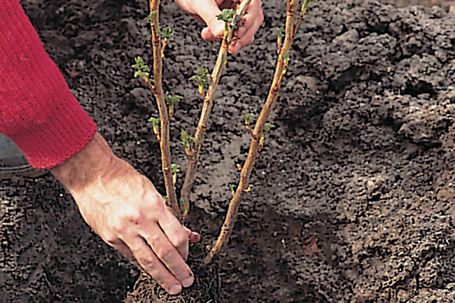 Далі рослина засипають землею, поливаючи водою, акуратно утрамбовуючи грунт носком ноги у напрямку до стовбура. Зазвичай рослина садять удвох. Один тримає кущ, другий – закопує.